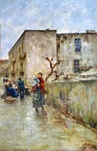 Pratella Attilio (Lugo di Romagna, RA 1856 - Napoli 1949) Strada di Napoli olio su tavola cm 35x23 firmato in basso a destra: A.Pratella a tergo timbro Coll. Casciaro, Napoli