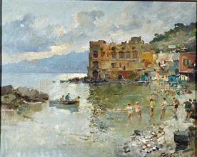 Giordano Felice (Napoli 1880 - Capri 1964) Pescatori a Palazzo Donn'Anna olio su tela cm 40x50 firmato in basso a destra: Giordano Feline