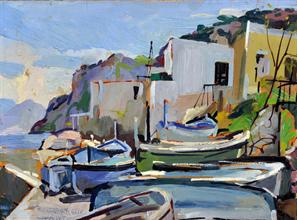 Di Marino Francesco (Napoli 1892 - 1954) Marina con barche olio su tavola, cm 25x35 firmato in basso a destra: Di Marino