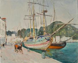 Cortiello Mario (Napoli 1907 - S.Sebastiano al Vesuvio,NA 1981) Ischia olio su tela, cm 50x60 firmato e datato in basso a sinistra: Mario Cortiello Ischia 1952 a tergo Cartiglio dell'artista
