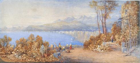 Rowbotham Thomas Charles Leeson (1823 - 1875) Vietri, Golfo di Salerno acquerello su carta, cm 18x49 firmato, numerato e datato in basso a sinistra: T.L. Rowbotham N. 653 1867