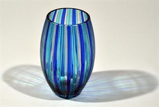Vaso ovoidale in vetro blu con inclusione di canne policrome verticali. MURANO. h cm 28