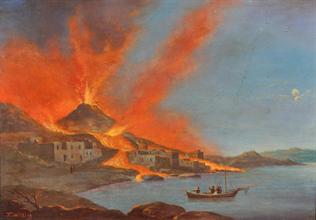 Autore del XIX secolo Eruzione del Vesuvio olio su tavola, cm 32x44 iscritto in basso a sinistra: T. Witting