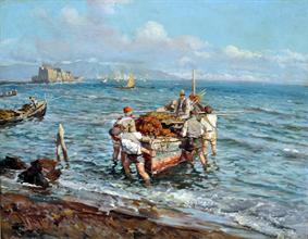 Giardiello Giuseppe (Napoli 1871 - 1916) Pescatori a Mergellina olio su tela rip. su cartone, cm 62x83,5 firmato e iscritto in basso a sinistra: Giardiello Napoli