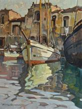 Sablautzki Alfredo (Prussia 1921 - Napoli 2003) Barche all'attracco olio su tavola, cm 15x20 firmato in basso a sinistra: Alfredo Sablautzky