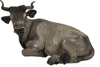 • Bue accosciato di Tommaso Schettino, in terracotta policroma, largh. cm 18, h cm 12,5