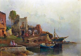 • Verdecchia Carlo (Atri, TE 1905 - 1984) Chirichetti olio su tavola, cm 70x50 firmato in basso a sinistra: C. Verdecchia a tergo timbro e cartiglio Galleria Mediterranea,Napoli