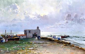 • De Corsi Nicolas (Odessa-Ucraina 1882 - Napoli 1956) Marina con pescatori olio su masonite, cm 50x100,5 firmato in basso al centro : De Corsi