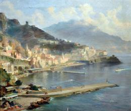 Galante Francesco (Margherita di Savoia, FG 1884 - Napoli 1972) Mattino d'ottobre Amalfi olio su tela cm 60x70 firmato in basso a sinistra: F. Galante a tergo firmato, datato e iscritto: F. Galante Mattino d'ottobre Amalfi 1965; cartiglio Mostra antologica Circolo Artistico Politecnico Napoli Esposizioni: Napoli 1965