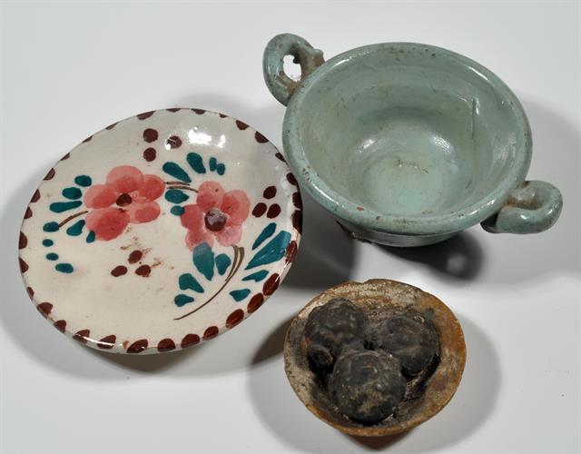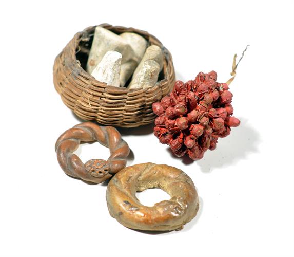 Lotto composto da: cestino con ricotta, pomodorini del piennolo e pezzi di pane in terracotta policroma diametro cm 5