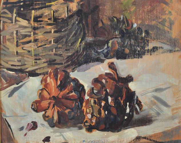 Scognamiglio Roberto (Napoli 1883 - 1964) Pigne olio su tavola, cm 38x45 firmato in basso al centro: R. Scognamiglio