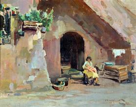 • Nicolas De Corsi ( Odessa (Ucraina) 1882 - Napoli 1956 ) Interno di cortile olio su tela cm 36x46 firmato in basso a destra: De Corsi