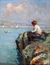 • Francesco Lojacono ( Palermo 1838 - 1915 ) Pescatorello olio su cartone cm 9x11 firmato in basso a destra: F.Lojacono
