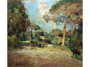 Villani Gennaro (Napoli 1885 - 1948) Paesaggio con asinello olio su cartone cm 30x38 firmato in basso a sinistra:G.Villani