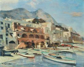 White Valentino (Positano,SA 1909 - 1986) Paesaggio marino olio su cartone, cm 45x39,5 firmato in basso a sinistra: V. White