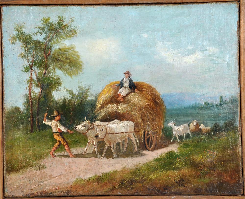De Angelis A.De Angelis A. (XIX - XX secolo) Ritorno dai campi olio su cartone cm 21x14 firmato e datato in basso a sinistra: A.De Angelis 1933