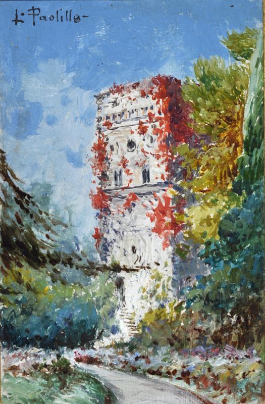 Paolillo LuigiPaolillo Luigi (Maiori, SA 1864 - Vietri sul Mare 1934) Villa Rufolo olio su cartone cm 14,2x9,2 firmato in alto a sinistra: L. Paolillo