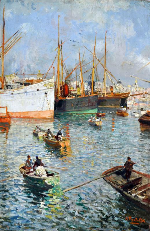 Pratella AttilioPratella Attilio (Lugo di Romagna, RA 1856 - Napoli 1949) Barche nel porto di Napoli olio su tavola cm 35x23 firmato in basso a sinistra: A. Pratella