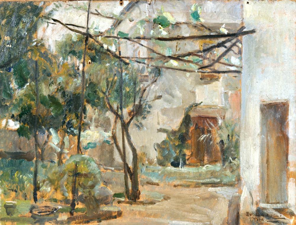 Catelli CamilloCatelli Camillo (Napoli 1886 - 1978) Paesaggio con case e pergolato olio su tavola cm 50x70 firmato e datato in basso a sinistra: C. Catelli 1955