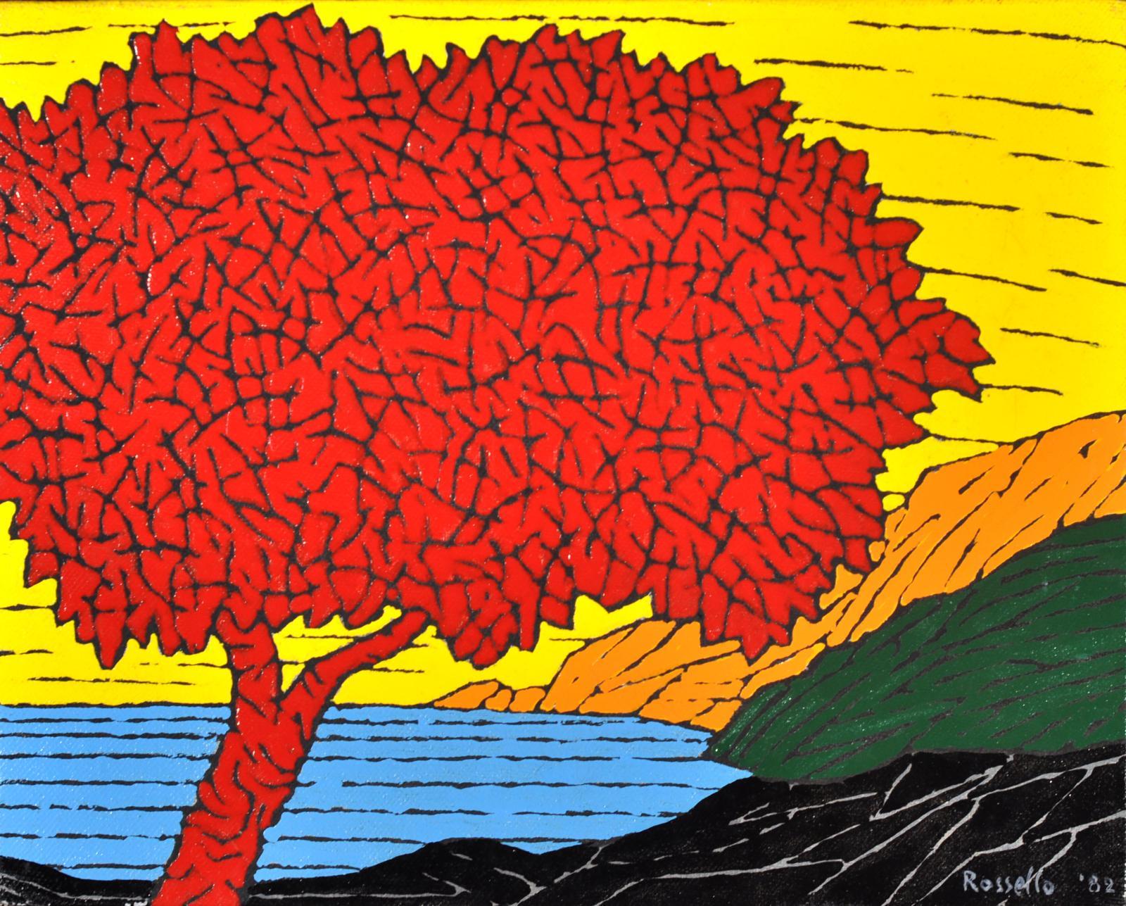 Rossello Mario (Savona 1927 - 2000) Albero su paesaggio marino olio su tela, cm 24x30 firmato e datato in basso a destra: Rossello 82 Provenienza: Galleria Apogeo, Napoli