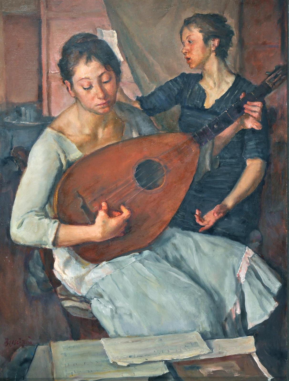 Bresciani Antonio (Napoli 1902 - 1998) Lezioni di musica olio su tela, cm 80x60 firmato in basso a sinistra: BrescianiL’arte di Antonio Bresciani oscillò sempre fra l’attento studio e la raffinata ripresa dei grandi maestri dei secoli precedenti (soprattutto sei-settecenteschi, e dunque di chiara ispirazione caravaggesca, laddove al Nord Italia il Novecento incoraggiava un ritorno ai canoni Medievali e Rinascimentali) e la loro traduzione appunto secondo il nuovo gusto novecentesco.Particolarmente favoriti gli furono i soggetti femminili, talvolta nudi (e pertanto sospesi fra innocenza e sensualità), più spesso tratti dai suoi affetti personali (si ricordino i vari ritratti della moglie), tutti comunque fissati in opere di genuina piacevolezza. Un più specifico filone riguarda le ballerine e la danza, o comunque un tema musicale, di cui l’opera proposta è chiaramente un esempio.