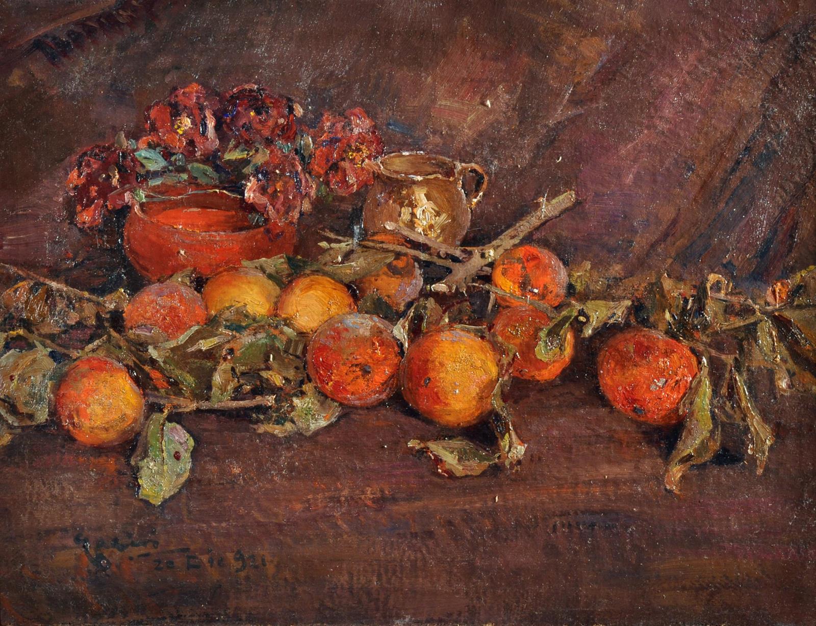 Casciaro Giuseppe (Ortelle, LE 1863 - Napoli 1941) Natura morta olio su tela, cm 35x46,5 firmato e datato in basso a destra: G. Casciaro Dic 921 a tergo timbro dell'artista