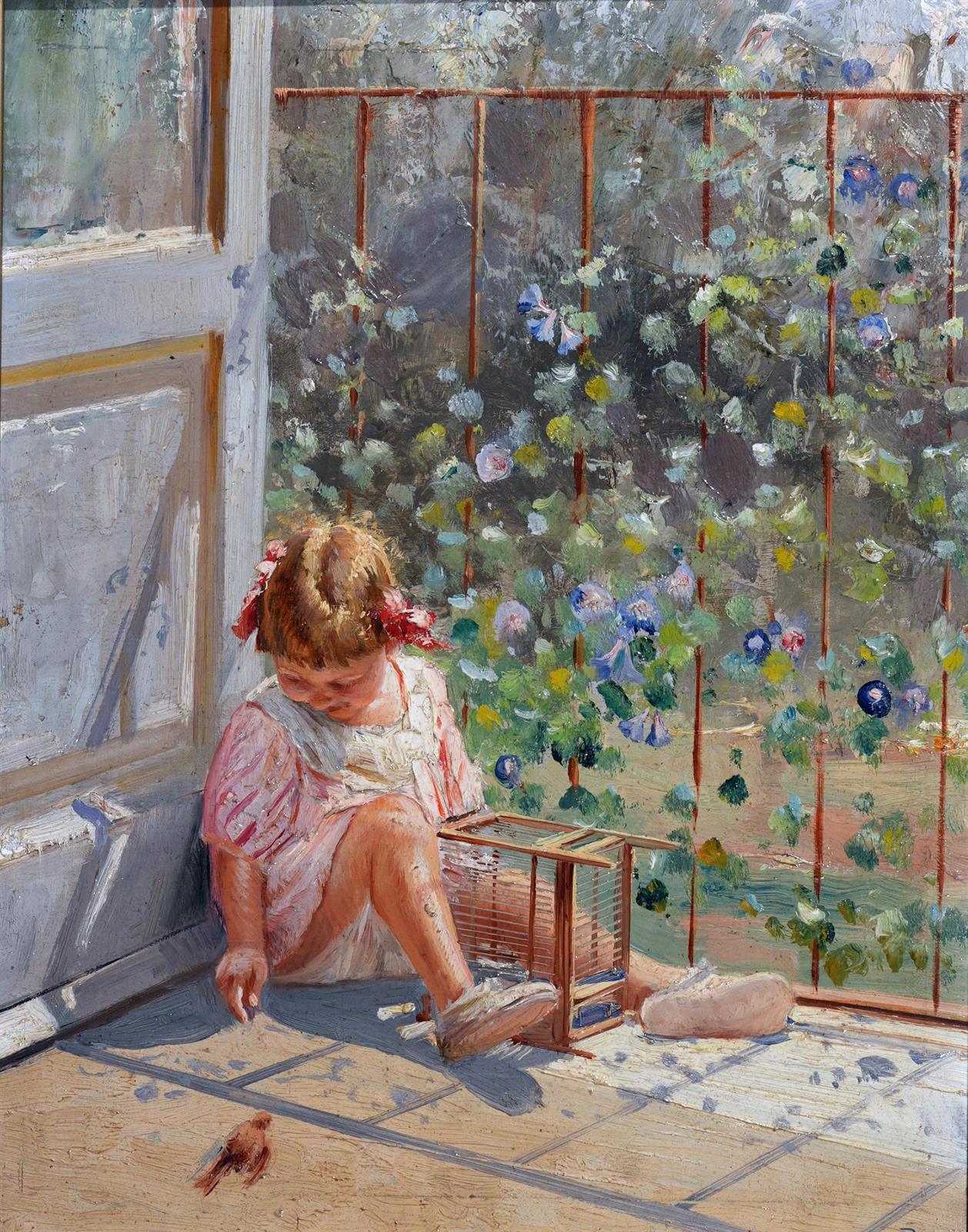 Panza Giovanni (Napoli 1894 - 1989)Bimba in terrazza olio su tavola, cm 30x25 firmato in basso a sinistra: G. Panza