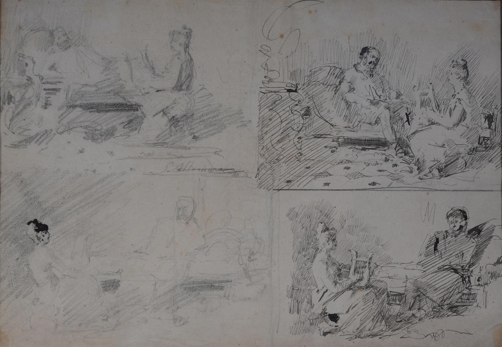 Altamura Saverio (Foggia 1822 - Napoli 1897)Studi di interno con figure(n. 4) matita su carta, cm 21x29,5firmato al centro: S. Altamura