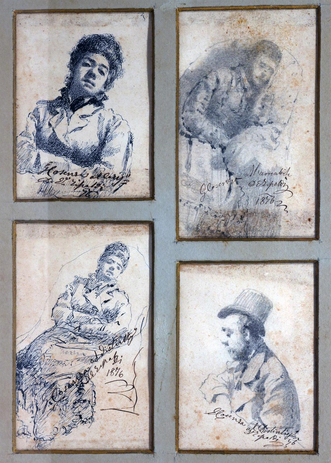 Cosenza Giuseppe (Luzzi, CS 1846 - New York 1922)a) Ritratto femminilechina su carta, cm 9x6,5firmato e datato in basso a destra: G. Cosenza 76b) Bambinomatita su carta, cm 11x7firmato, datato e iscritto in basso al centro: G. Cosenza All'amabile... 76c) Figura femminilechina su carta, cm 11x7firmato, datato in basso a destra: G. Cosenza 76d) Profilo maschilematita su carta, cm 7x7firmato e datato in basso a destra: G. Cosenza 76